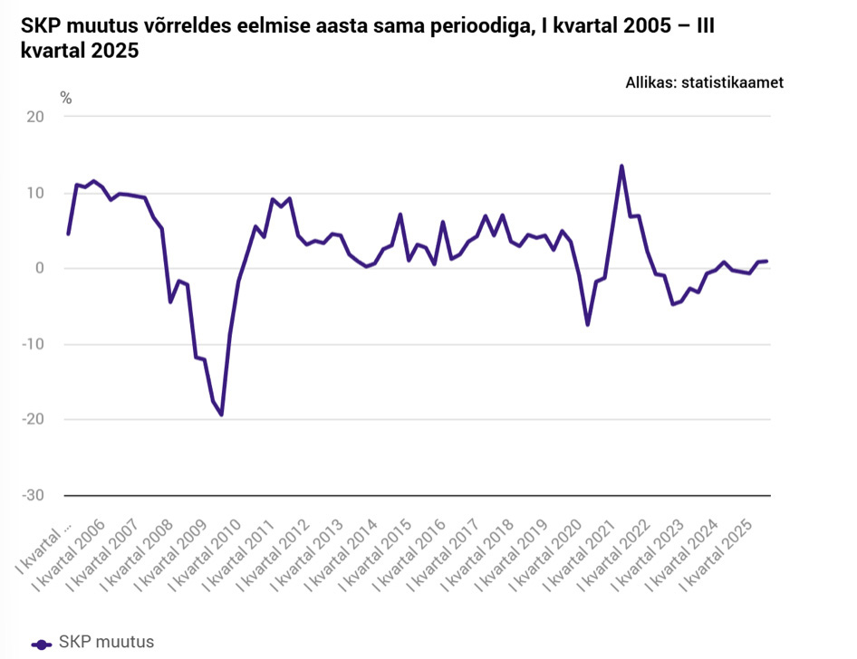 Avaldatud: 1 detsember, 2025Statistikaameti andmetel suurenes sisemajanduse koguprodukt (SKP) 2025. aasta kolmandas kvartalis võrreldes eelmise aasta sama ajaga 0,9 protsenti. Jooksevhindades moodustas SKP kolmandas kvartalis 10,5 miljardit eurot. Majanduskasv jätkus eelmise kvartali tempos.