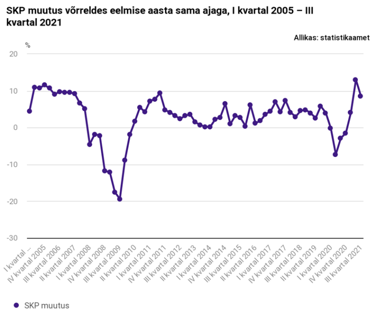 Võrreldes eelmise kvartaliga kasvas sesoonselt korrigeeritud SKP 0,7 protsenti ja võrreldes 2020. aasta kolmanda kvartaliga kasvas 9,2 protsenti.