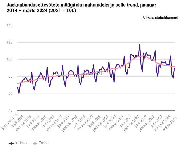 Avaldatud: 30 aprill, 2024Statistikaameti andmetel oli jaekaubandusettevõtete müügitulu 2024. aasta märtsis 851 miljonit eurot. Võrreldes eelmise aasta sama kuuga vähenes müügimaht 4 protsenti.