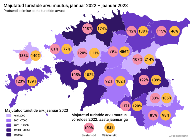 Statistikaameti analüütiku Helga Laurmaa sõnul väisas jaanuaris Eesti majutusettevõtteid üle 82 000 välis- ja üle 114 000 siseturisti. 2022. aasta jaanuariga võrreldes oli välisturiste 54% rohkem, aga siiski vähem kui vahetult enne kriisi 2020. aasta jaanuaris. „Välisturistide arv majutusettevõtetes on võrreldav 2017. aasta jaanuariga. Siseturistide arv suurenes aastaga 9% ja saavutas jaanuarikuise kõigi aegade rekordi,“ täpsustas Laurmaa.