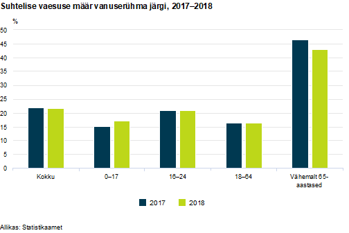 Suhteline vaesus on aastaga jäänud muutumatuks noorte ehk 16–24-aastaste hulgas (20,9 protsenti), kuid on suurenenud laste seas. Aastal 2018 elas alla 18-aastastest lastest suhtelises vaesuses 17,1 protsenti ehk 1,9 protsendipunkti enam kui aasta varem. Küll aga langes laste absoluutse vaesuse määr, mis oli 2017. aastal 2,5 protsenti ja 2018. aastal 1,6 protsenti. Vähenenud on vanemaealiste suhteline vaesus: 2018. aastal elas vähemalt 65-aastastest elanikest suhtelises vaesuses 43,1 protsenti ja 2017. aastal 46,4 protsenti.