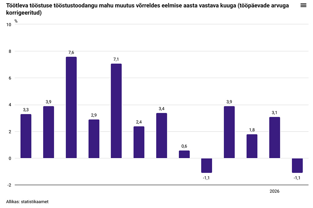 Avaldatud: 6 aprill, 2026Statistikaameti andmetel tootsid tööstusettevõtted 2026. aasta veebruaris püsivhindades 0,5 protsenti vähem toodangut kui eelmisel aastal samal ajal. Tööstuse kolmest sektorist kasvas toodang mäetööstuses 1,3% ja energeetikas 3,1%, kuid kahanes töötlevas tööstuses 1,1%.