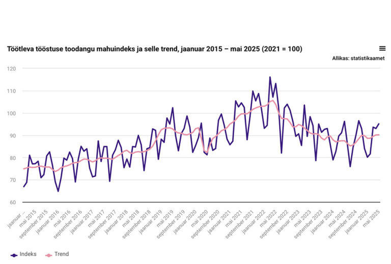 Avaldatud: 4 juuli, 2025Statistikaameti andmetel tootsid tööstusettevõtted 2025. aasta mais püsivhindades 0,9% rohkem toodangut kui 2024. aastal samas kuus. Tööstuse kolmest sektorist kasvas toodang töötlevas tööstuses 1,4% ja energeetikas 6,9%, kahanes mäetööstuses 19,7%