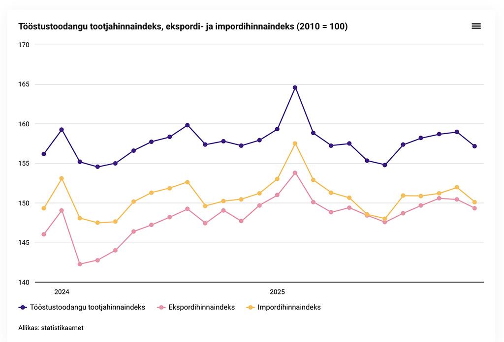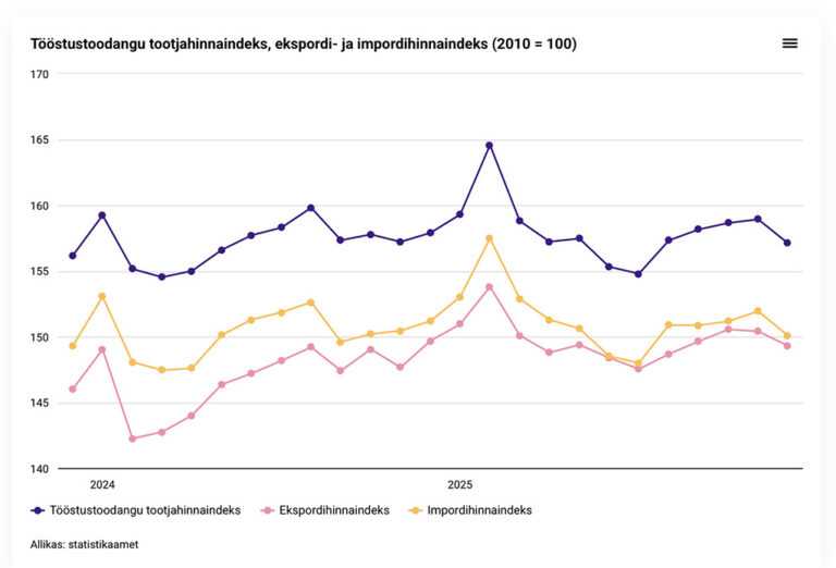 Avaldatud: 20 jaanuar, 2026Tööstustoodangu tootjahinnaindeks, mis iseloomustab Eestis nii koduturule kui ka ekspordiks valmistatud tööstustoodete hindade muutust, langes 2025. aasta detsembris võrreldes novembriga 1,1 protsenti ja võrreldes 2024. aasta detsembriga 0,5 protsenti. Indeksit mõjutas enim hinnalangus kütteõlide tootmises ja elektri- ja soojusenergiaga varustamises.
