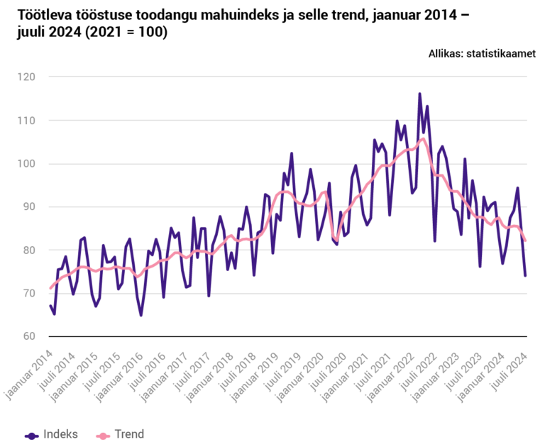 Avaldatud: 4 september, 2024Statistikaameti andmetel tootsid tööstusettevõtted 2024. aasta juulis püsivhindades 5,8 protsenti vähem toodangut kui eelmise aasta samas kuus. Tööstuse kolmest sektorist kasvas toodang mäetööstuses 16,9% ja energeetikas 16,3%, kuid kahanes töötlevas tööstuses 7,8%.