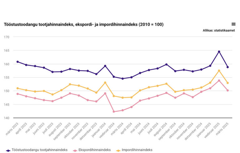 Avaldatud: 21 aprill, 2025Tööstustoodangu tootjahinnaindeks, mis iseloomustab Eestis nii koduturule kui ka ekspordiks valmistatud tööstustoodete hindade muutust, langes 2025. aasta märtsis võrreldes veebruariga 3,5 protsenti ja tõusis võrreldes eelmise aasta märtsiga 2,8 protsenti.