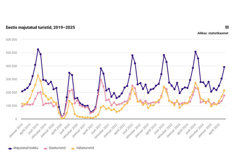Avaldatud: 8 august, 2025Statistikaameti andmetel peatus 2025. aasta juunis majutusettevõtetes ligi 391 000 turisti, mida on 2 protsenti rohkem kui aasta varem samal ajal. Välisturiste oli 5% rohkem ja siseturiste 2% vähem.