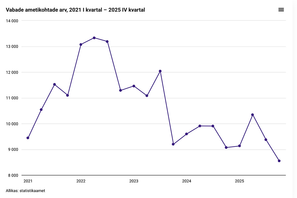 Avaldatud: 10 märts, 2026Statistikaameti andmetel oli 2025. aasta neljandas kvartalis Eesti ettevõtetes, asutustes ja organisatsioonides kokku 8553 vaba ametikohta. Kõige enam vabu ametikohti oli hariduse ning hulgi- ja jaekaubanduse tegevusaladel.
