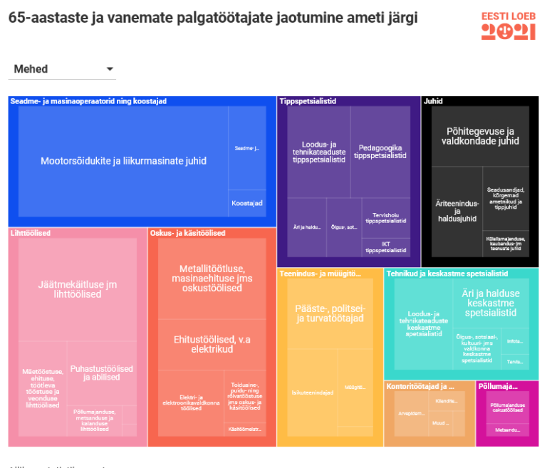 Avaldatud: 20 detsember, 2022Rahvaloenduse värsketest tulemustest selgus, et tööga hõivatud vanemaealisi on Eestis rohkem kui kunagi varem. 65-aastaseid ja vanemaid elab Eestis kokku 272 164. Ootuspäraselt naudib 80 protsenti neist pensionipõlve, kuid 2021. aasta lõpu seisuga käib iga viies pensioniealine (51 196 inimest) ka tööl. 10 aastat tagasi oli see suhtarv kaks korda väiksem – 65-aastastest ja vanematest oli siis tööga hõivatuid 10 protsenti. Muutus on olnud suur, seega vaatab juhtivanalüütik Triinu Aug tänases statistikablogis täpsemalt, mis tööd vanemaealised teevad.