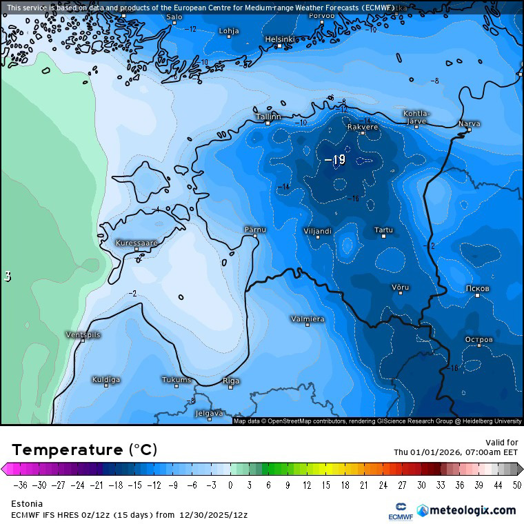 Avaldatud: 31 detsember, 2025Täna õhtupoolikul hakkab õhk sisemaal järsult külmenema. Uusaastaööl langeb termomeetrinäit sisemaal -15 kraadist madalamale.