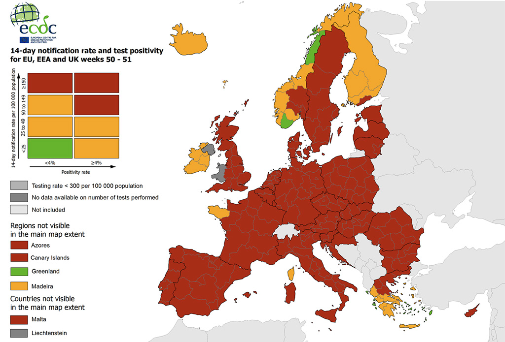 ECDC avaldas ka indikatiivse ohukaardi, kus terve Euroopa on punane, välja arvatud Soome, Norra, Iirimaa ja Island.
