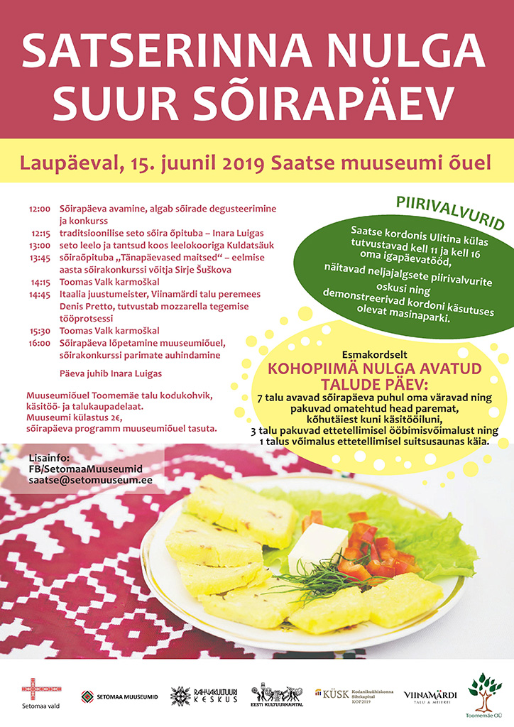 Avaldatud: 7 juuni, 2019Saatserinna nulga Sõirapäev toimub juba kümnendat korda, kuid seekord suuremana kui varasematel aastatel. 15. juunil oodatakse inimesi tutvuma Setomaa Kohopiimä nulga nime all tuntud Saatse kandiga – uksed avavad nii kohalikud talud kui Saatse kordon ning sõirapäeva programmiga kostitab Saatse muuseum.