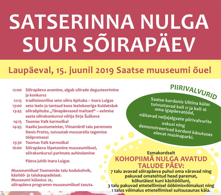 2019. aasta sõirapäev tuleb senistest suurem ja seekord on laiemalt kaasatud ka kogukond. Esmakordselt saab tutvuda Saatse kandi taludega. Kella 11-17ni pakutakse omatehtud head paremat, kõhutäiest käsitööiluni, ollakse valmis külalistele oma kodukandist ja töödest-tegemistest jutustama ning mõnda talusse võib lausa öömaja küsida.