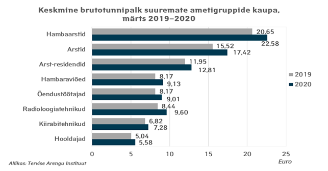 Arstide mediaan kuupalk koos kõigi lisatasudega oli 2020. aastal 3036 eurot, õendustöötajatel 1582 eurot ning hooldajatel 991 eurot, kasvades aastaga vastavalt 13,3 protsenti, 11,5 protsenti ja 12,4 protsenti. „Eelmise aastaga võrreldes palgakasv kiirenes. Kuna analüüsi aluseks on märtsikuu andmed, siis üheks palgakasvu mõjutajaks on COVID-19ga seoses alanud eriolukord ning seetõttu lisatasude ja tavapärasest kõrgema töötasu maksmine,“ kommenteeris TAI tervisestatistika analüütik Kai Maasoo.
