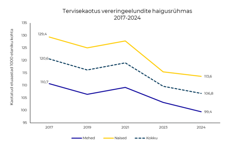 Tervisekaotus oli 2024. aastal veidi väiksem kui aasta varem (langus 0,4%), kuid siiski 2% kõrgem kui 2019. aastal. Mehed kaotasid enneaegsete surmade ning haigestumise tõttu 196 754 ja naised 225 486 aastat. Enneaegsete surmade tõttu on kaotatud eluaastate arv viie aastaga meestel vähenenud üks ja naistel kaks protsenti. Naiste suurem tervisekaotus on seotud nende pikema elueaga.