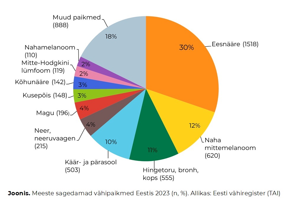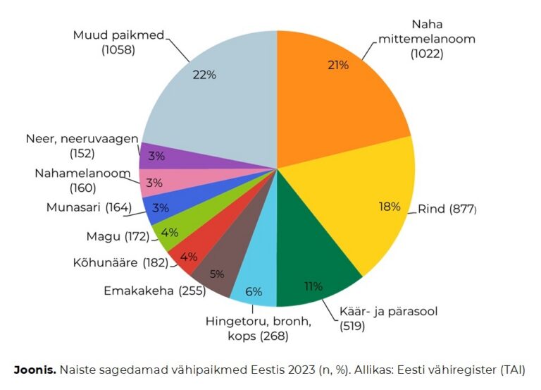 Avaldatud: 21 oktoober, 2025Tervise Arengu Instituudi (TAI) hallatava vähiregistri andmetel diagnoositi Eestis 2023. aastal 9843 vähi esmasjuhtu, neist meestel 5014 ja naistel 4829. Vähidiagnooside sagenemise põhjuseks on tõenäoliselt nii rahvastiku vananemine, tervishoiusüsteemi taastumine pandeemia mõjudest kui ka sõeluuringutel osalemise kasv.