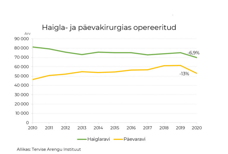 TAI täna avaldatud statistika kohaselt opereeriti 2020. aastal haiglaravis ligikaudu 70 000 ja päevaravis 53 000 patsienti. See tähendab, et haiglaravi (v.a õendusabi) patsientidest opereeriti 39 protsenti ja päevaravi patsientidest kaks kolmandikku. Opereeritute muutus on enam väljendunud päevaravis ja laste seas. Laste päevakirurgias opereeritute arv vähenes aastaga 25 protsenti.