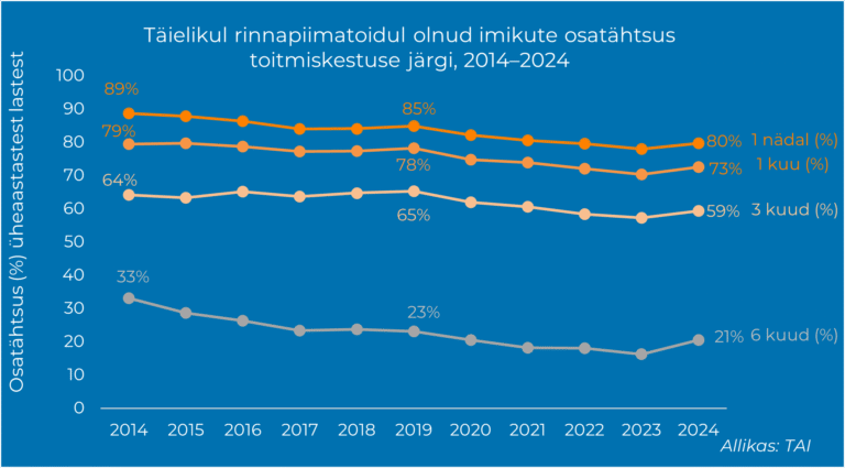 „Viimase kümne aasta jooksul on täieliku rinnapiimatoitmise määr kõigi jälgitavate toitmiskestuste osas järk-järgult vähenenud. Stabiliseerumine toimus aastatel 2017–2019, ent pärast COVID-19 kriisi algust 2020. aastal algas uus langusperiood. Seetõttu on 2024. aasta mõõdukas tõus positiivne, kuid siiski jäävad näitajad veel alla 2019. aasta taseme,” selgitas TAI vanemanalüütik Eva Andreson.