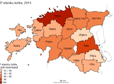 2015. aastal oli SKP elaniku kohta 15 405 eurot, mis on 375 eurot rohkem kui aasta varem. Suurim oli SKP elaniku kohta Harju maakonnas – 144 protsenti Eesti keskmisest. Järgnesid Tartu maakond ja Ida-Viru maakond, kus SKP elaniku kohta oli vastavalt 90 ja 63 protsenti Eesti keskmisest.