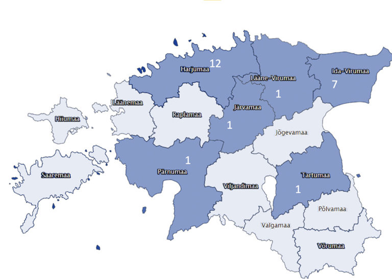 Kõige enam nakatumisi on olnud viimase paari nädala jooksul Harumaal (12) ja Ida-Virumaal (7). Nakatumistest 12 on saadud kodus, 8 on sisse toodud välismaalt, 1 on saadud tööl ja 1 päritolu on teadmata.