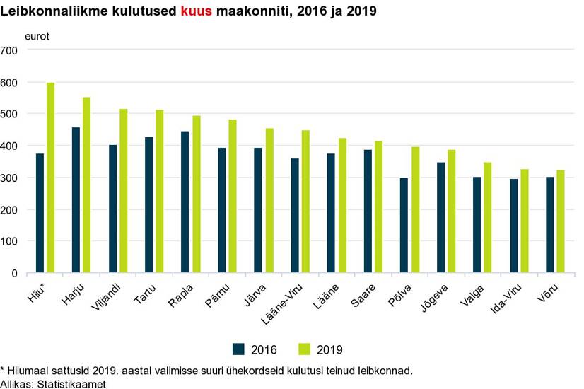 Maakonniti olid kõige suuremad väljaminekud Hiiu*, Harju ja Viljandi maakonnas ehk vastavalt 598, 553 ja 515 eurot leibkonnaliikme kohta kuus. Kõige väiksemad olid väljaminekud Võru ja Ida-Viru maakonna leibkondadel, vastavalt 325 ja 327 eurot kuus leibkonnaliikme kohta.