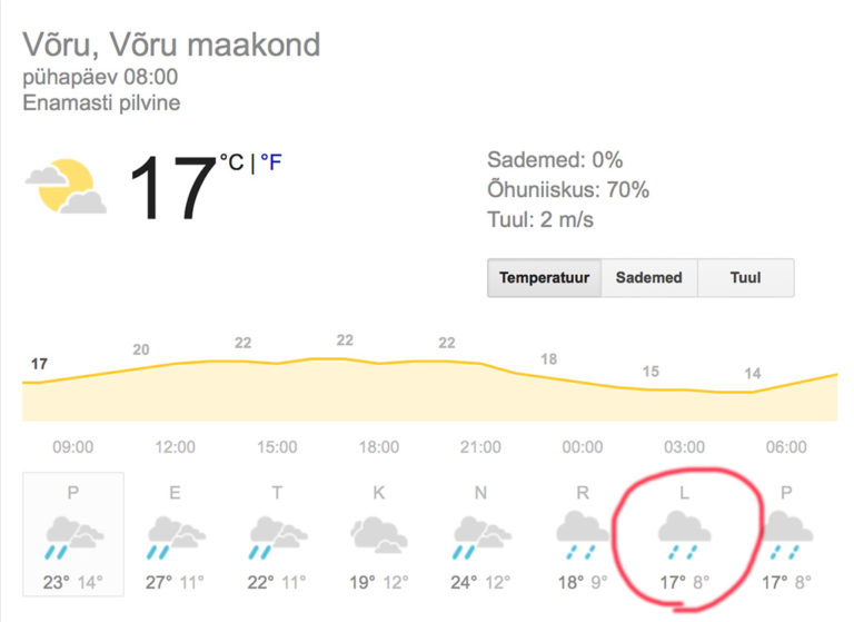 Avaldatud: 17 juuni, 2018Kuigi veel mõned päevad tagasi prognoosisid ilmateenistused, et 23. juuni jaanilaupäev tuleb kuiv ja soe, siis oli see ekslik. Värske prognoosi järgi on terve jaaninädal jahe ja vihmane ning jaaniõhtul loomulikult sajab. Õnneks mitte lund.