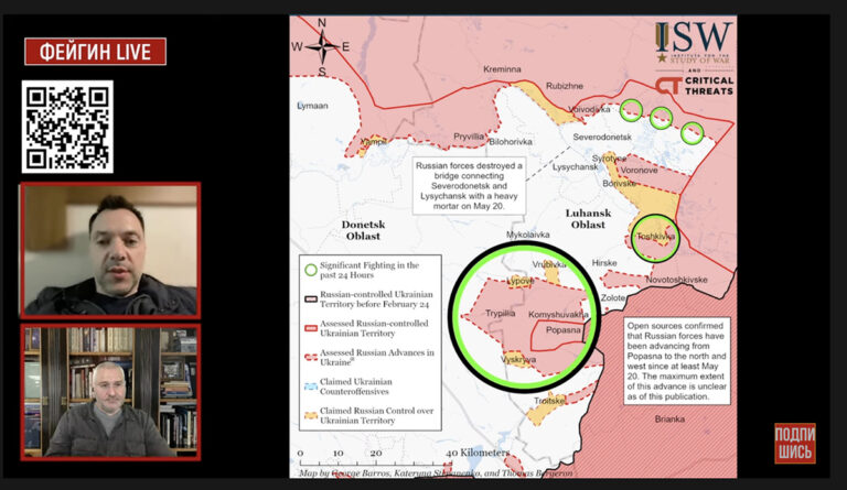 Saates näidati ka kaarti, kust on näha, et rõngas Ukraina idaosas Severodonetski juures tõmbub koomale. Arestovõtš ütles, et Vene väed tungivad väga agressiivselt peale ja vaatamata suurtele kaotustele Ukraina vägede hulgas pole võimalik seal positsioone hoida.