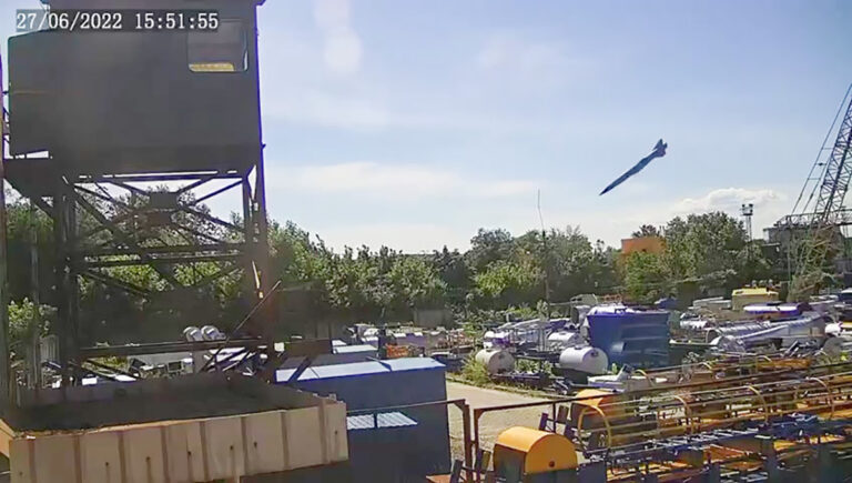Videos on näha, kuidas Vene tiibrakett tabab otse kaubanduskeskust Amstor. Kõrvalasuv masinatehas pihta ei saanud.