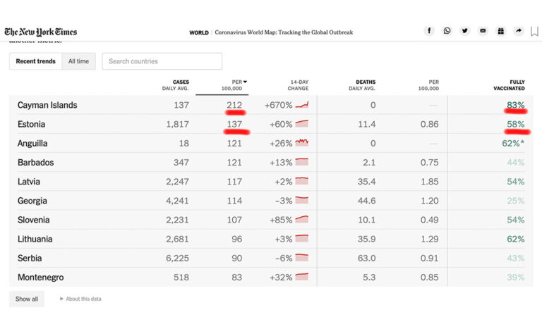 Tähelepanuväärne on aga see, et Kaimani saartel on 83 protsenti elanikest koroona vastu vaktsineeritud. See on üks kõrgeim number maailmas. Võrdluseks, Eesti vaktsineeritus on vaid 58 protsenti, Soomes 71 protsenti.