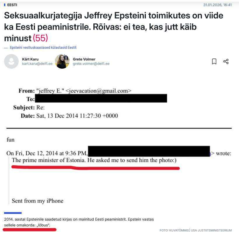 Avaldatud: 31 jaanuar, 2026USA kurikuulsa pedofiili Jeffrey Epsteini toimikutes on viide ka Eesti peaministrile.