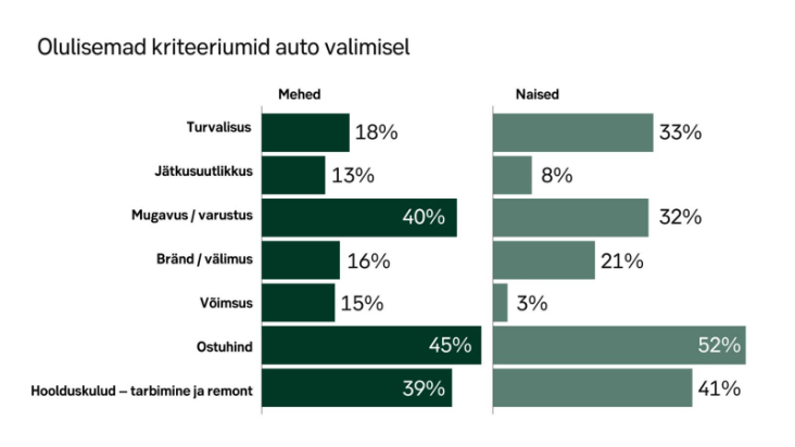 Eesti noored valivad isiklikku sõidukit eelkõige ostuhinna (48%) ja hoolduskulude järgi (40%). Ligi kolmandik hindab mugavust ja turvalisust. Väheste jaoks (18%) on oluline ka bränd ja välimus. Kõige vähem pööratakse tähelepanu võimsusele ja jätkusuutlikkusele. Tulemused kinnitasid muuseas pikalt püsinud eelarvamusi: kui mehed peavad oluliseks auto tehnilisi omadusi, seejuures võimsust, siis naiste jaoks on olulisem valikukriteerium sõiduki välimus.