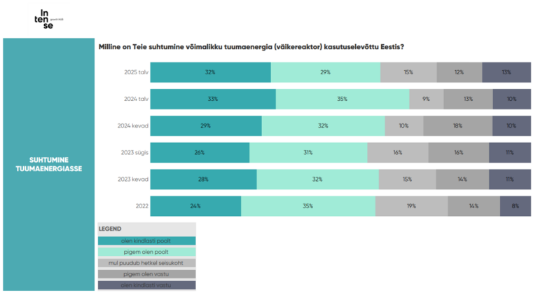 Tuumaenergia kasutuselevõttu Eestis toetab kokku (olen kindlasti poolt ja pigem olen poolt) 61 protsenti inimestest. Keskmisest enam pooldavad tuumaenergiat mehed, eestlased ning 50-aastased ja vanemad elanikud. Samas hindavad venekeelne elanikkond ning madalama haridustasemega vastajad tuumaenergia potentsiaali märksa tagasihoidlikumalt. Kuigi võrreldes 2024. aastaga on toetajate osakaal mõnevõrra vähenenud, on tuumaenergia toetus viimase kolme aasta vaates püsinud stabiilselt ligikaudu 60 protsendi tasemel.