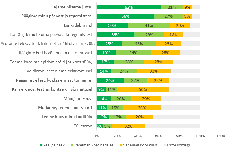 Eesti lapsed mängivad, matkavad, spordivad ja kõige sagedamini ajavad oma isadega lihtsalt juttu või arutavad ilma asju. Enam kui pooled lastest räägivad oma isaga igapäevaselt niisama juttu, sh räägivad isale enda päevast ja tegemistest (56 protsenti igapäevaselt).