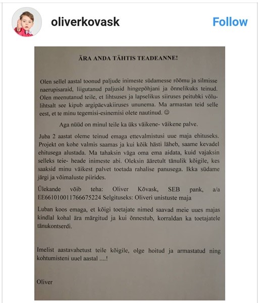 Avaldatud: 2 jaanuar, 2018Vahetult enne uut aastat ilmus Valgamaa Tõrva valla poisi Oliver Kõvaski kontole Instagramis teade, milles ta palus rahalist abi majaehituseks. Pärast seda aga puhkes pahameeletorm, mille peale oli Oliveri ema sunnitud teatama, et rahaküsimine oli viga ning praeguseks on poisi konto Instagramis üldse kustutatud.