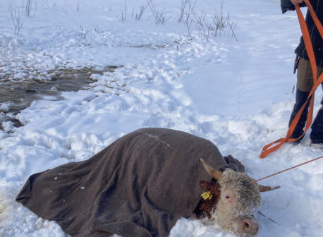 Pinnaltpäästevarustuses päästjad läksid looma juurde ja panid talle pea vee peal hoidmiseks nööri ümber sarvede.