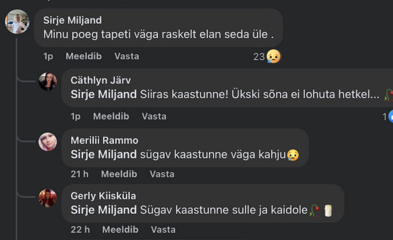 Tapetud mehe nimi on Maido Miljand (37). Tema ema Sirje Miljand kirjutab sotsiaalmeedias: „Minu poeg tapeti väga raskelt elan seda üle.”
