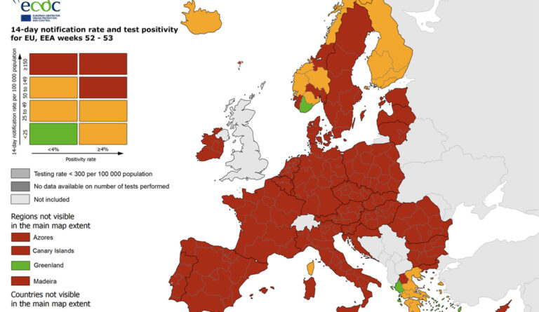 ECDC koroona indikatiivsel kaardil on Euroopa jätkuvalt valdavas osas punane, välja arvatud heledamad laigud Soome, Island, Norra ja Kreeka.