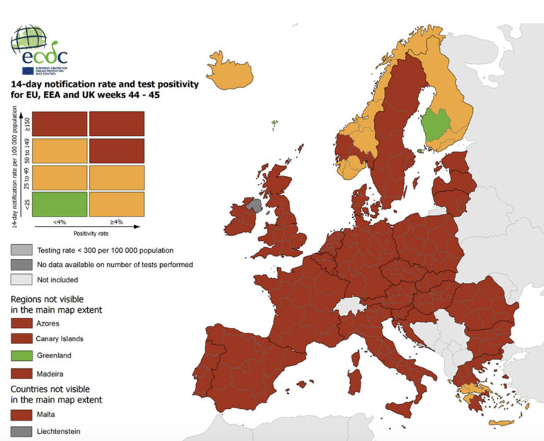 Avaldatud: 14 november, 2020Euroopa haiguste kontrollikeskuse ECDC värske koroonakaart näitab, et Eesti on värvunud punaseks, nii nagu ülejäänud Euroopa. Ainus roheline laik on Soomes.