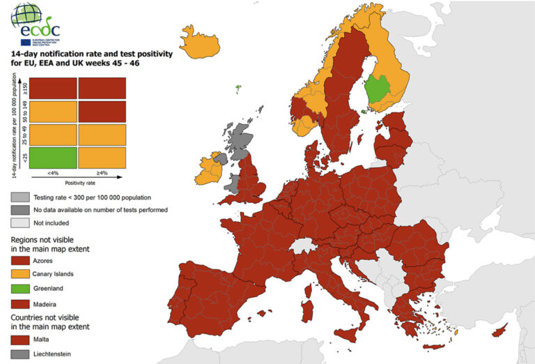Avaldatud: 19 november, 2020Euroopa koroonakaardil on ainus roheline laik Soomes, selgub Euroopa haiguste kontrollikeskuse ECDC värsketest andmetest.