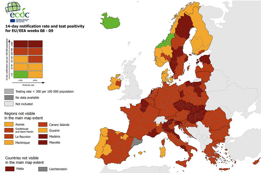 ECDC indikatiivse koroonakaardi järgi on Euroopa muutumas koroona osas üha heledamaks, on üksikud tumedad laigud, mille hulka kuulub Eesti. Island ja osa Norrat on juba täiesti rohelised ehk seal koroonat praktiliselt pole.