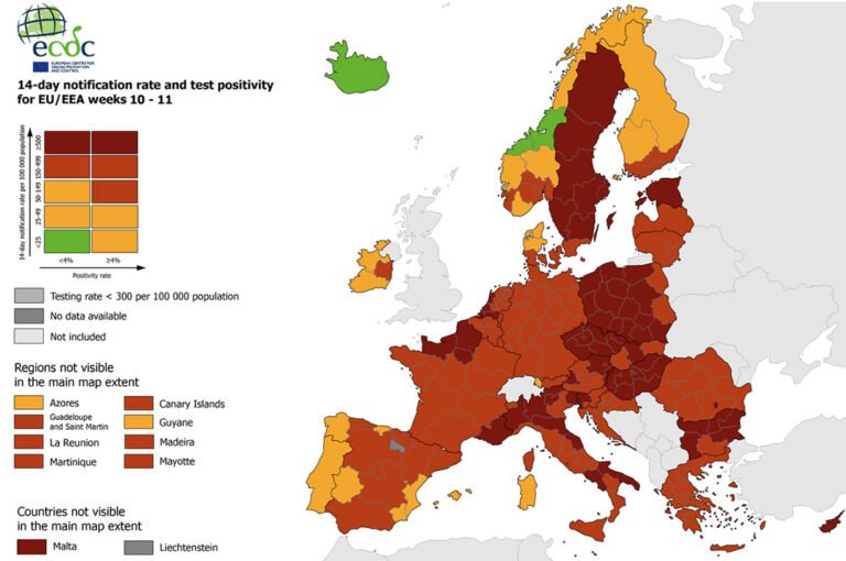 Euroopa teises otsas on Island (15 juhtu 100 000 elaniku kohta 14 päeva jooksul), järgnevad Portugal (71), Liechtenstein (111), Hispaania (143), Iirimaa (149), Soome (173), Taani (189), Saksamaa (195) ja Norra (223).