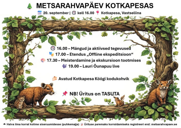 Avaldatud: 15 september, 2025Laupäeval, 20. septembril 2025 toimub Võrumaal Kotkapesa Puhkekeskuses Metsarahvapäev.