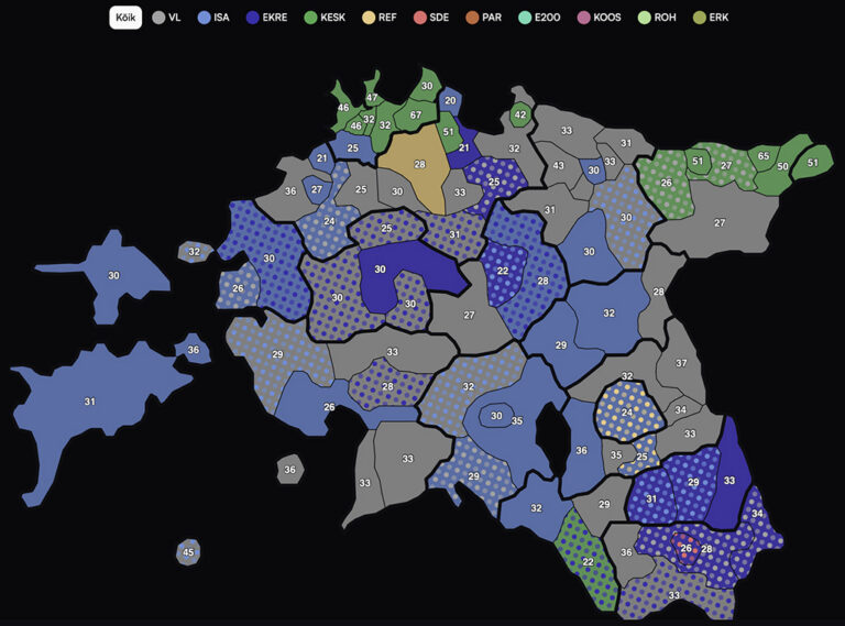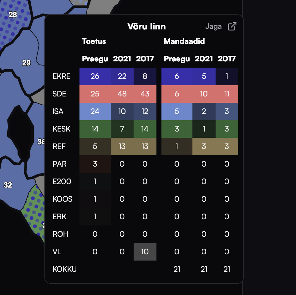 Kui muidu on Eesti valdavalt sinine, ehk siis Isamaa ja EKRE toetajad, Ida-Virumaa, Tallinn ja Valga vald on rohelised, ehk Keskerakonna toetajad, siis Võru linn on punane ehk sotside toetajad, selgub ülevaatest.
