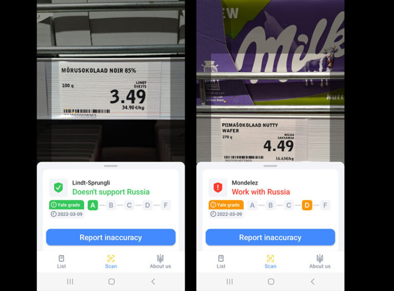 Piltidel on näha äpi väljavõtetest, kuidas Šveitsi šokolaadifirma Lindt ei tee koostööd Venemaaga, aga teine Šveitsi šokolaaditootja Milka, mis kuulub USA firmale Mondelez teeb koostööd Venemaaga.