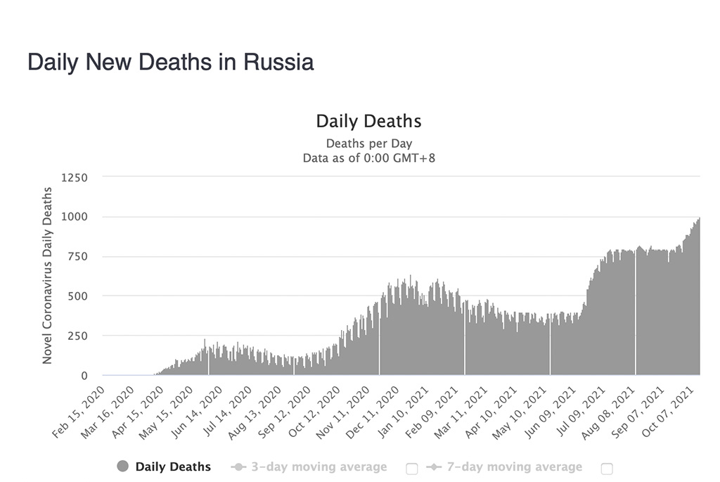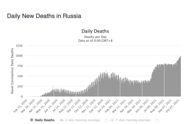 Avaldatud: 16 oktoober, 2021Vaatamata sellele, et Venemaal võeti esimesena maailmas kasutusele koroonavaktsiin ja juba aasta aega on seal inimesi vaktsineeritud, on koroona olukord järjest hullem. Täna tuli taas uus koroonarekord: 33 208 uut nakatumist ja 1002 koroonasurma.