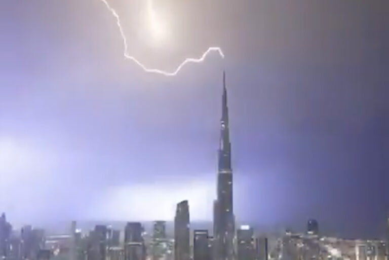 The moment lightning struck the Burj Khalifa, the tallest building in the world, during a storm in Dubai. pic.twitter.com/UCP3P5fra8
