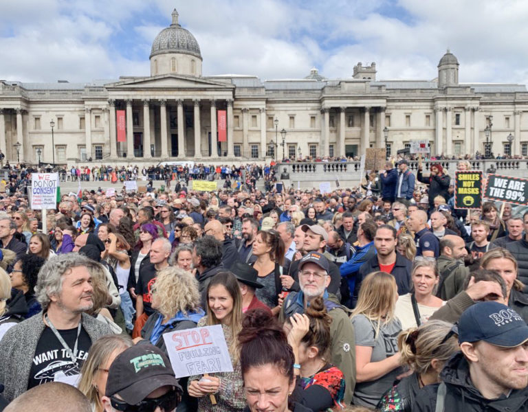 Trafalgari väljakul toimunud meeleavalduse peakõneleja oli tuntud skeptik David Icke, kes on vaktsineerimise vastane ja leiab, et kogu viiruse jutt on välja mõeldud Bill Gatesi poolt selleks, et inimesi nõela otsa saada.