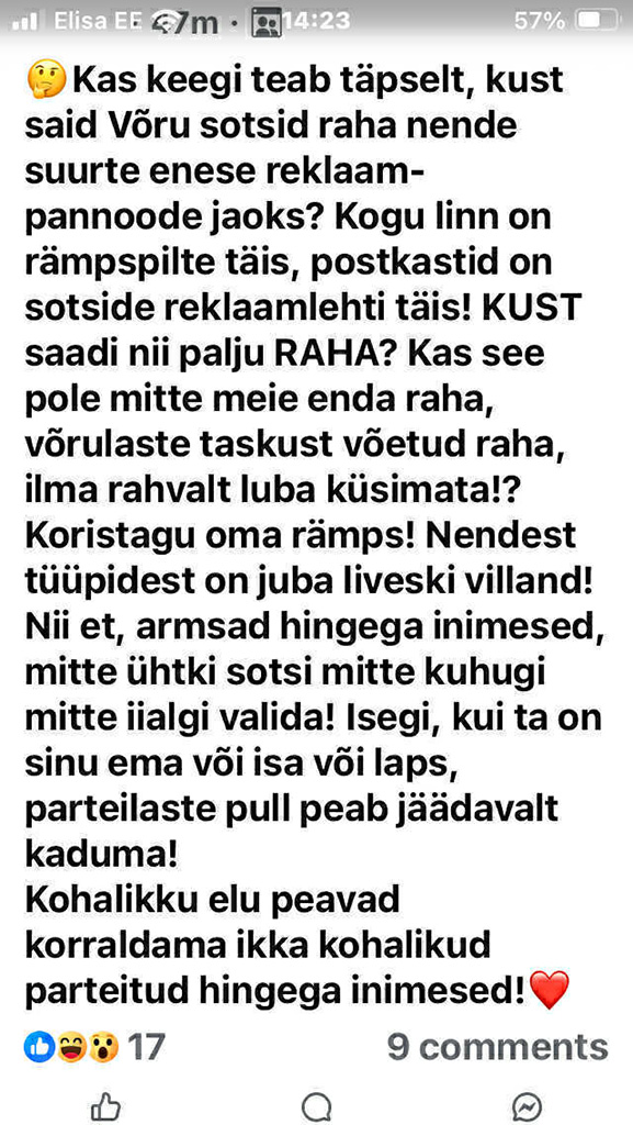 Sotsiaalmeedias küsitakse, kas keegi teab täpselt, kust said Võru sotsid raha nende suurte enese relaampannoode jaoks? Kogu linn on rämpspilte täis, postkastid on sotside reklaamlehti täis!