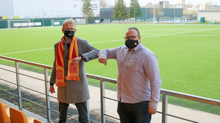 ASi Barrus juhatuse liige Martti Kork (vasakul) ja Võru FC Heliose tegevjuht Jaanus Vislapuu Barrus Arenal. Foto: Võru FC Helios Võru FC Heliosele kuuluv Võru jalgpallikeskus hakkab klubi uue suurtoetaja ASi Barrus järgi kandma nime Barrus Arena.