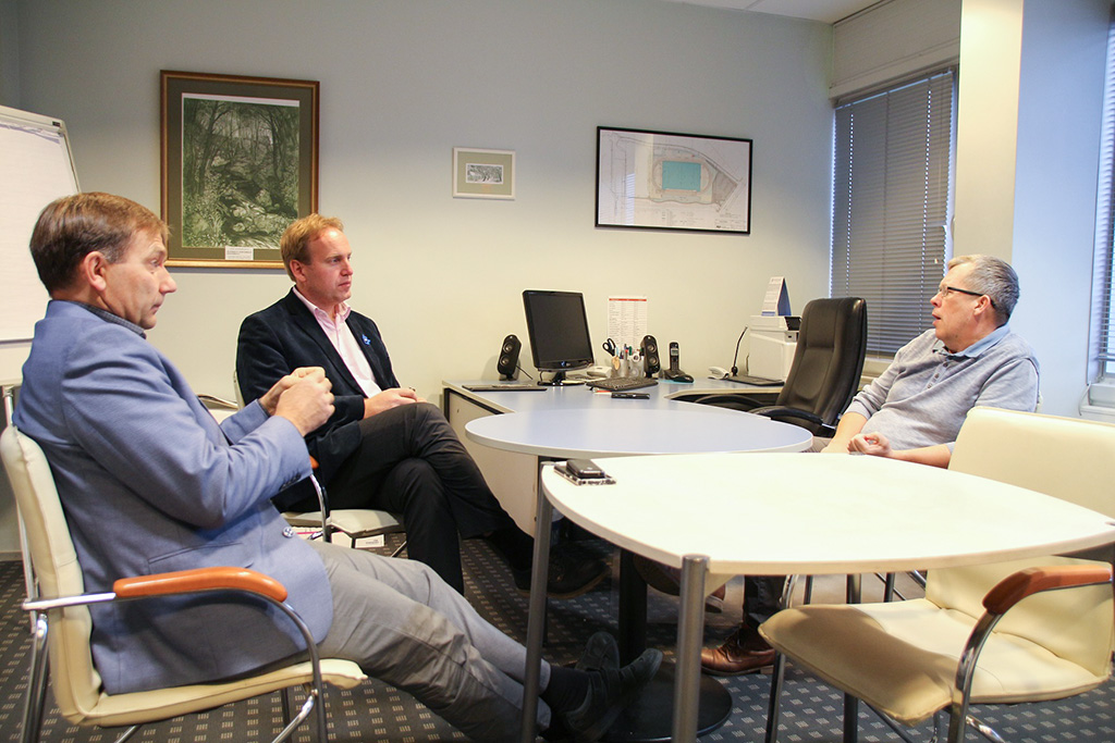 Abilinnapea Sixten Sild (vasakult), linnapea Anti Allas ja spordikeskuse uus juht Rein Reitalu esimesel töisel kohtumisel. Foto: Võtu LV